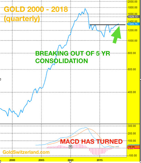 In my opinion, gold is now in the process of breaking out from the 5 year consolidation. We need to get proper confirmation with a move to $1,400 but the position of the quarterly chart confirmed by the rising MACD indicator is a strong sign that the next move in gold to new highs is imminent.