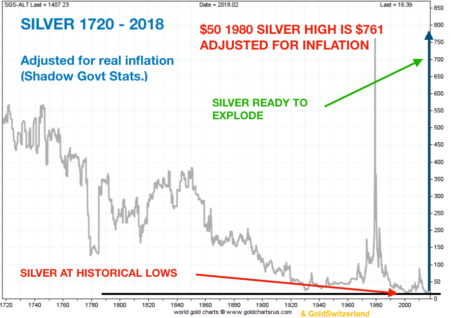 Silver is even more undervalued. On the same inflation adjusted basis, silver is also at a 300 year low. At $17.20 today, inflation adjusted silver is the same as in 2000 at around $4. And the 1980 silver high of $50 would today be $761 – a 44x increase from here.