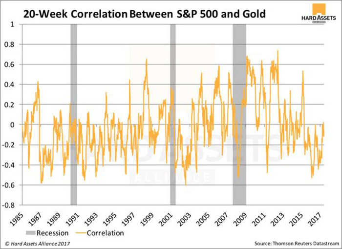 It’s true that gold has also gone up, but the correlation has been very low and, during times of recessions, tends to swing to the negative side, as you can see in the graph below.