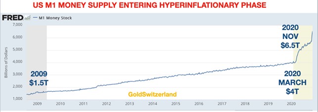 Here is even more confirmation of the coming hyperinflation in the form of US M1 Money Supply. In 2009 when the Great Financial Crisis was over M1 was $1.5 trillion. Then 11 years of “economic boom”??? saw an increase in M1 of $2.5t to $4t in March 2020.