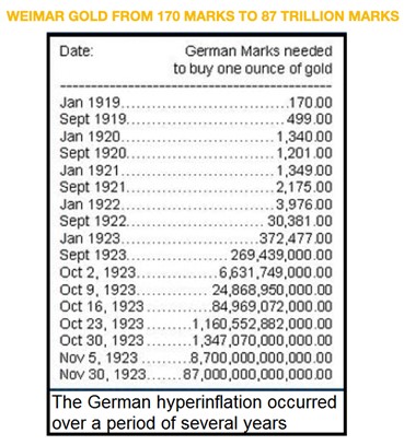 Gold was 170 marks in Jan 1919, 1,340 marks in Jan 1921, 3,976 Jan 1922 and 372,000 marks in Jan 1923.