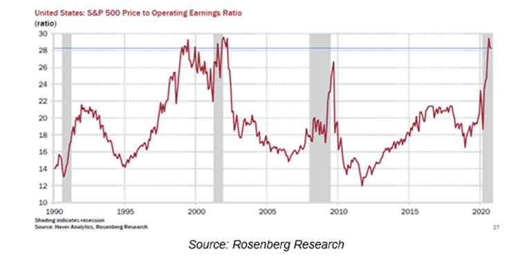 As Doug Cass recently reminded, nearly every traditional and once-respected measure of sound stock valuation—i.e., PE ratios (27.9), Cyclically Adjusted PE multiples (32.9), Price to Earnings ratios (27.9), Price to Sales (3.0) or even Buffet’s favorite, the classic Total Market Cap to GDP (170%)—are all at record high levels of over-valuation today.