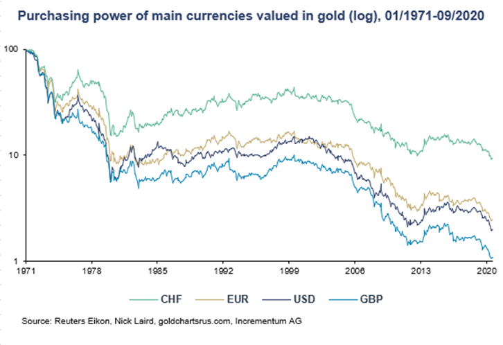 …it comes as no surprise that when measured against gold, the purchasing power of the major currencies has gone this way…