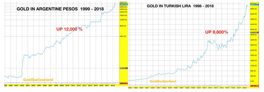 Although Venezuela is the only country currently in the Weimar league, many are on their way. Just look at Argentina and Turkey below with 12,000% and 10,000% inflation rate, measured in gold.