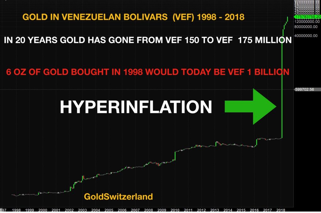 The chart of gold in Venezuelan Bolivars above is very typical for a hyperinflationary pattern. It starts at a relatively slow pace and then totally explodes like in Venezuela in 2018. And thus inflation this year will be 1 million percent instead of the expected 2,400%.