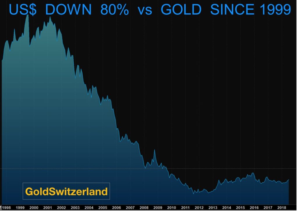 Major trends normally start in the periphery before they move into the centre. There is no better measure of hyperinflation than gold. Because gold reveals the mismanagement of the economy and the debasement of the currency that has been rampant in most countries in the last 100 years. If we just take the dollar, it has declined 97% against gold since 1970 and 80% since 1999.