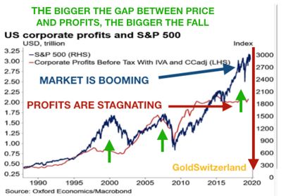 But profits have virtually stagnated since 2011 as the graph below shows. The gap between share price growth and profit has become much bigger than in 2000 and 2007 when we saw the big falls in stocks. The coming fall will be substantially bigger.