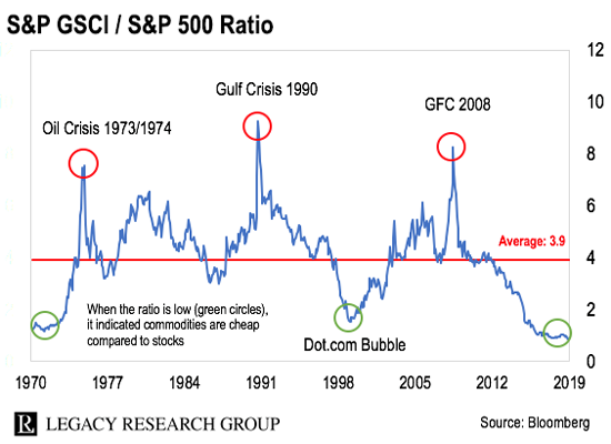 Commodities, including precious metals, are still at historically low prices to stocks. The reversal will start in 2020 and be devastating for the world. Stock investors will in coming years lose up to 95% in real terms. Food prices will surge and so will gold and silver. High food prices and shortages will cause major problems.