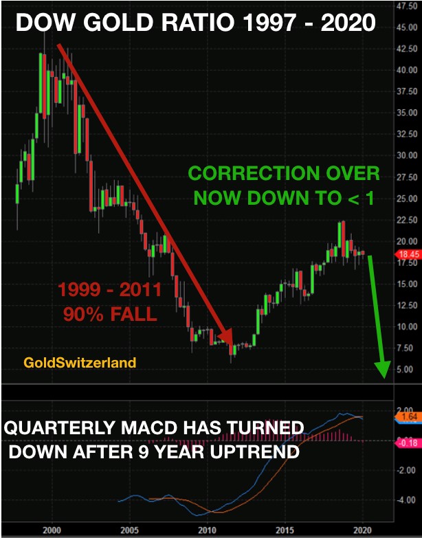 The turn down in the Dow will also be the start of a rapid fall in the Dow/Gold ratio and thus a very strong move up in gold.