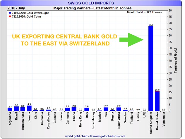 The chart below shows how central banks and bullion banks are losing their gold. The Swiss refiners, produce around 70% of the gold bars in the world. As the chart shows, they import their gold from a number of different sources. Surprisingly to many, in July 2018, by far the biggest purchase was from the UK with 67 tonnes. The UK is not a gold producing country. Instead these are 400oz bars from Western central banks that have been bought by China, India or Russia. The bars are sent to the Swiss refines to be broken down to 1kg bars and then shipped on to the Eastern buyers. The Swiss import statistics often show that the UK is a major exporter. This is very clear evidence that Central Banks are continuously reducing their holdings.
