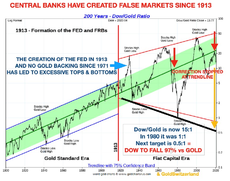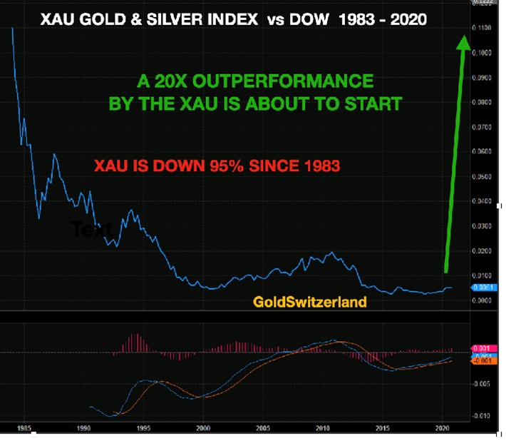 The chart below shows XAU gold – silver index against the Dow since 1983 when the XAU was introduced. Since then the XAU has lost 95% against the Dow. This fall is likely to be reversed in the next few years with the XAU going up 20x against the Dow . For Dow investors this means losing 95% against mining stocks.