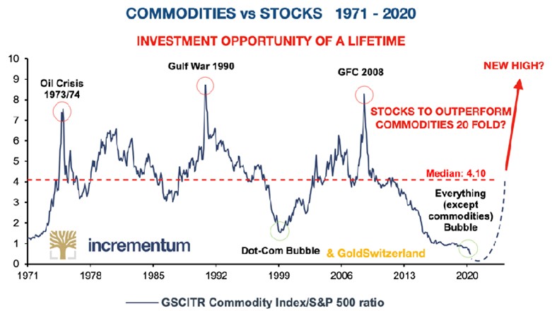 The biggest beneficiary of this coming boom will be commodity markets which are at a 50 year low versus stocks. Looking at the chart below, the minimum target would be commodities outperforming stocks by 4 to 1. Eventually a new high in commodities against stocks is likely. This would mean commodities outperforming stocks by 20x. The first part of this outperformance will come as stock markets rise. But the final phase will be when general stock markets collapse and commodities continue to strengthen. Goldman Sachs expect commodities to rise 28% in 2021. They expect inflation plus a commodities deficit will drive prices higher. And this is of course what the chart below tells us.