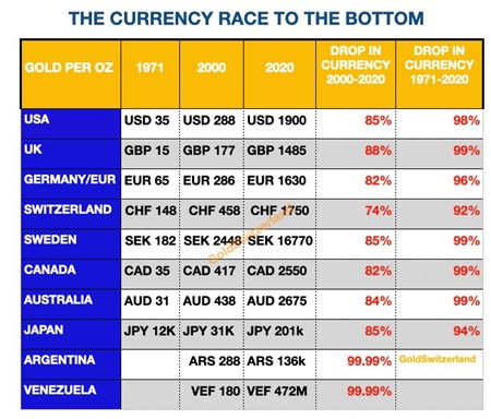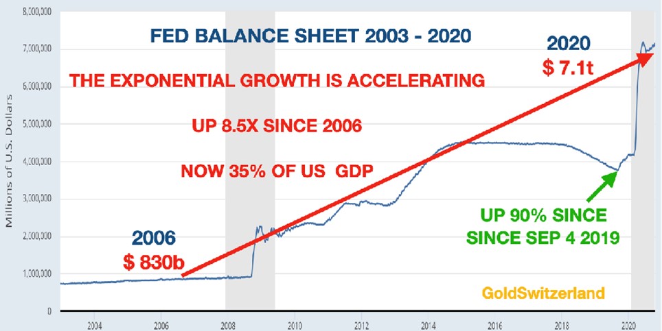 Goldman Sachs expects gold to reach $2,300 in 2021 but I believe that target is too conservative. Before gold breaks out above the August high at $2,074, a correction down to $1,800-20 is possible and would not change gold’s unstoppable rise. In this latest phase, gold is in a bull market or more correctly, the currencies are in a bear market since 1999. The continued debasement of the currencies is guaranteed by the central banks since they only have one option – TO PRINT AND PRINT AND PRINT until money dies.