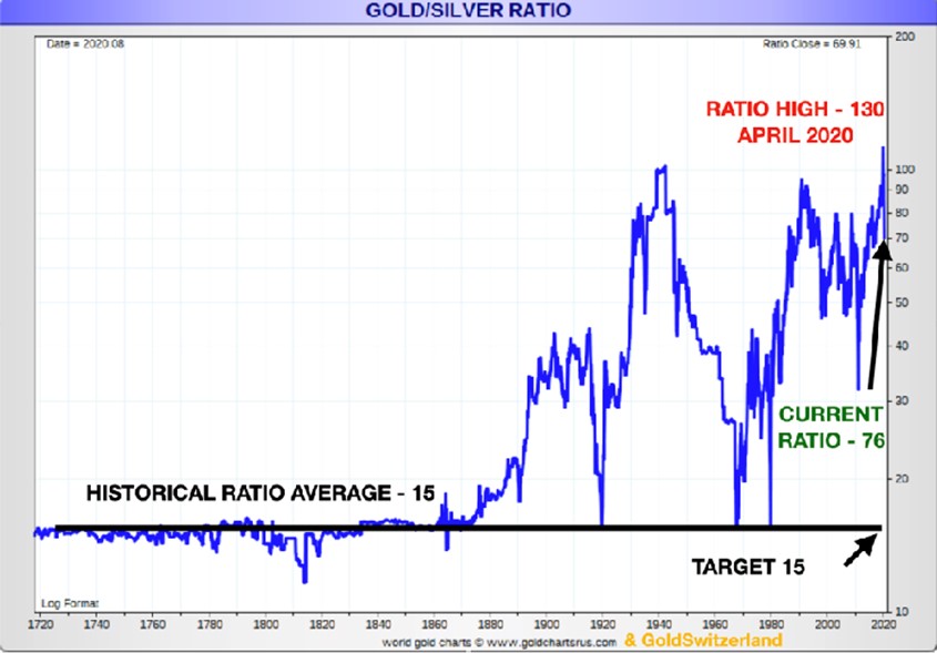 The gold silver ratio reached almost 130 in April which was an extreme. See chart. It is now down to 77 and likely to initially reach 30 where it was in 2011. Eventually we are likely to see the ratio back to the historical average of 15 or even 10 which the ratio of silver to gold in nature.