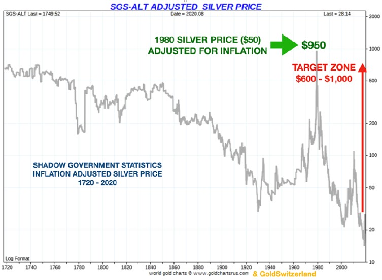 But if we look at silver adjusted for real inflation based on ShadowStatistics, the $50 high in 1980 would equal to $950 today. So silver at between $600 and $1,000 is not an unrealistic target.