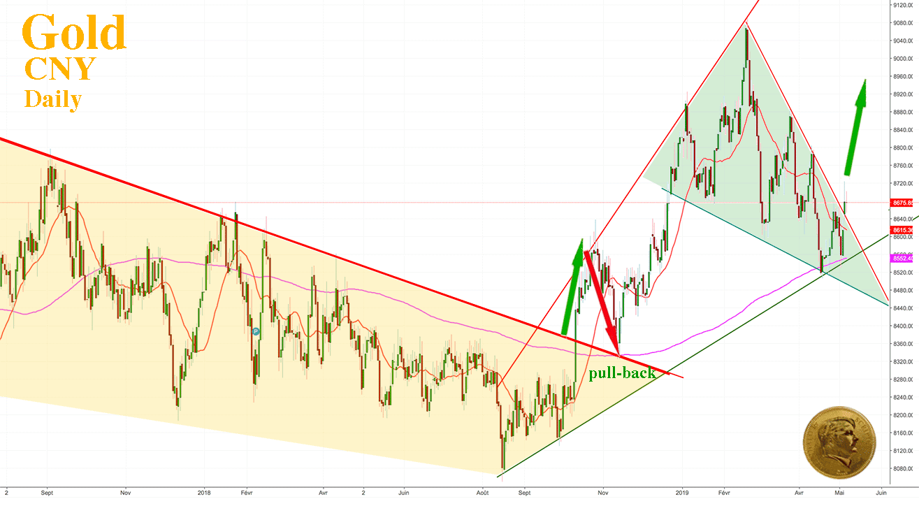 Over the past two days, gold in yuan has broken the resistance of the falling wedge, which pushed gold down, opening a vast space for it to rise.