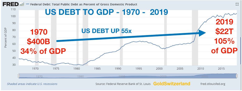US debt in 1971 was $400 billion which was 34% of GDP. Today US debt is 55x greater at $22 trillion and 105% of GDP.