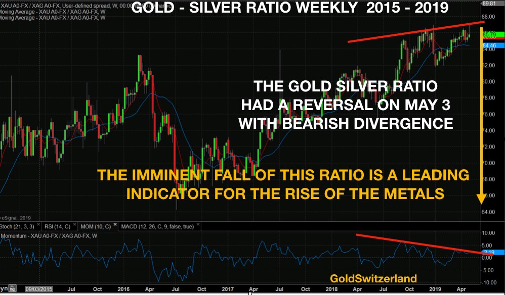 Gold and silver are finalising their correction now. We might have seen the correction lows already. If not they should happen in the next 2-3 weeks. The gold-silver ratio just made a new high above 87 and reversed quickly last week. From a technical perspective the high both on the daily, weekly and monthly indicators was not confirmed by momentum indicators. This is called bearish divergence and is an important sign of a market turning down.