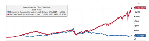 But commodities (blue line), for patient investors, are a far surer long-term bet than manipulated Treasuries, and a far better value than bubbled-stocks (red line).