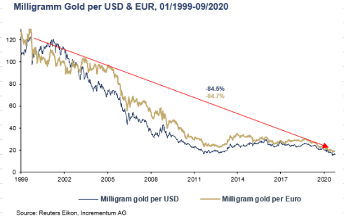 More printed currencies and more direct spending (rather than just lending) from desperate central banks points historically toward rising inflation and hence continuing currency debasement.