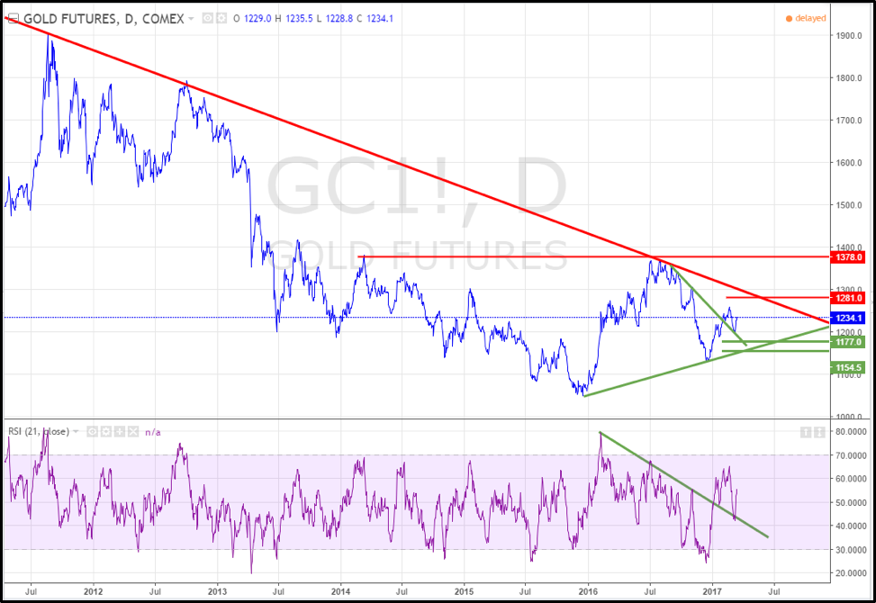 In the shorter-term, key Fibonacci levels corresponding to 61.8% retracements at $1281 and $1177 respectively provide important resistance and support. Confirmation pullbacks to previous trendline resistances on both prices and the RSI since the bounce following the Fed appear as positives, leaving gold poised to shape a new upleg and test $1281 in coming weeks.