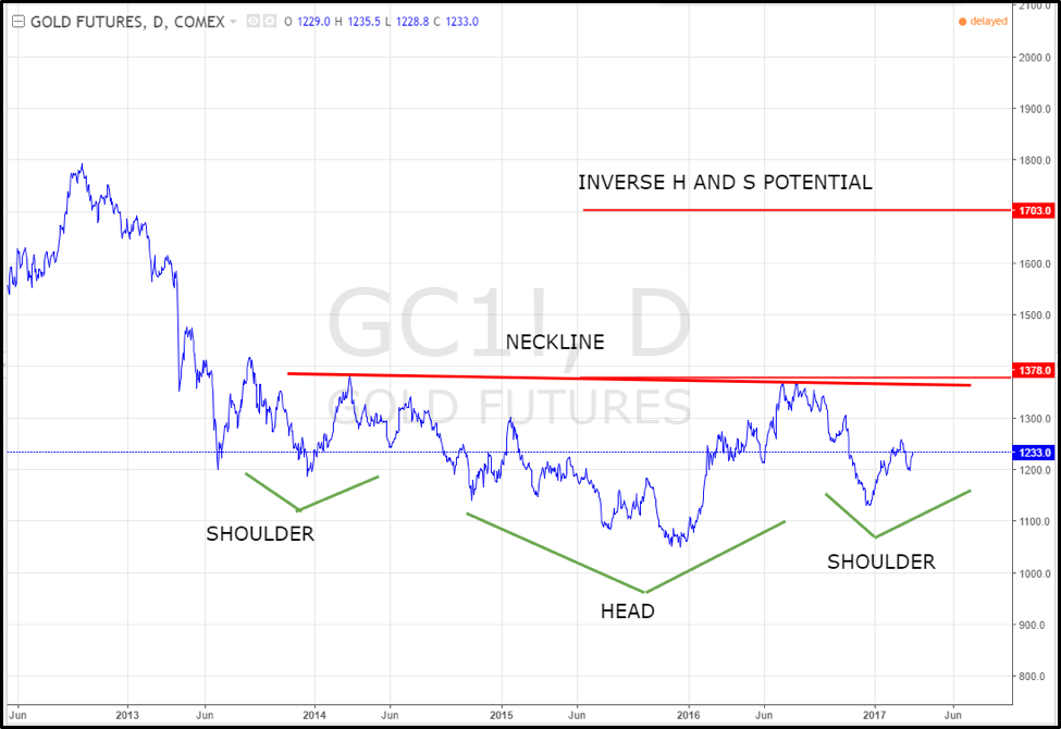 The above appears even more compelling in light of a possible inverse head and shoulders pattern under development on a daily chart, as depicted in the chart below. A breach of the neckline resistance around the $1378 level would provide impetus for a new and significant upleg, as the configuration would currently imply a potential target around $1703.