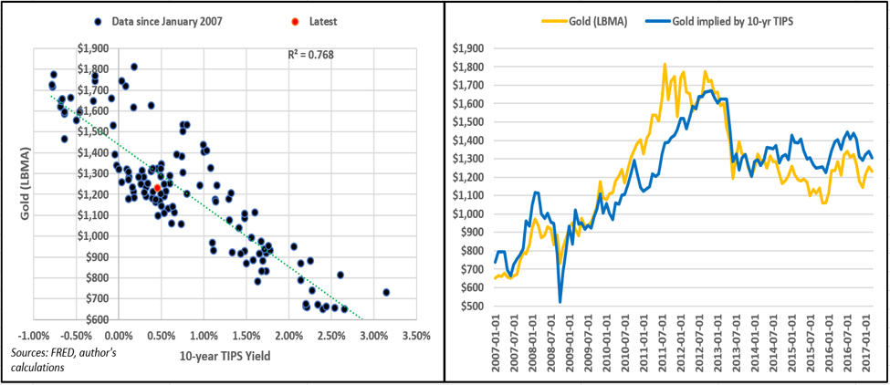 On the other hand, a real yield of 0% would be consistent with gold at $1437.9, with a 99% probability of prices ranging between $1392.4 and $1483.4. The current yield, around 0.50%, is consistent with LBMA gold prices at $1292.8.