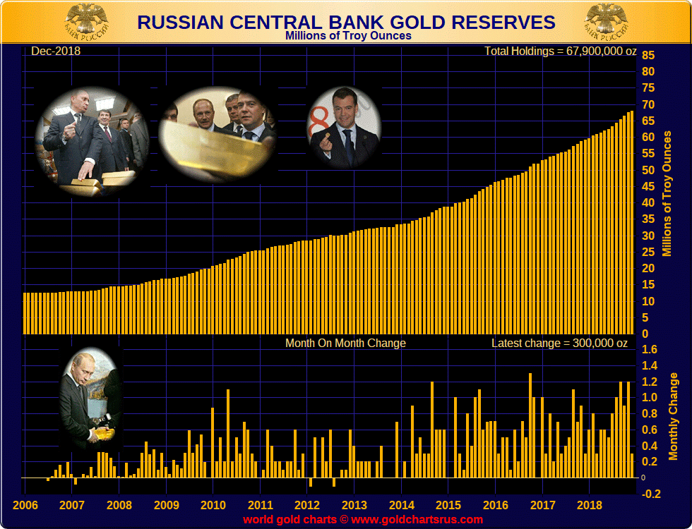 Russia’s central bank is buying domestically produced gold from commercial banks. The size of future purchases is a state secret. It is not clear whether it will keep raising its gold holdings at the same pace, of about 14 percent a year, in 2019.