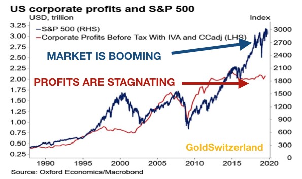 But all that is needed in overvalued markets is a break of confidence. And with the 3 dozen global risks that I outlined in last week’s article. The market is now in the final stage of uber-euphoria with prices going up whilst profits are stagnating as the graph below shows.