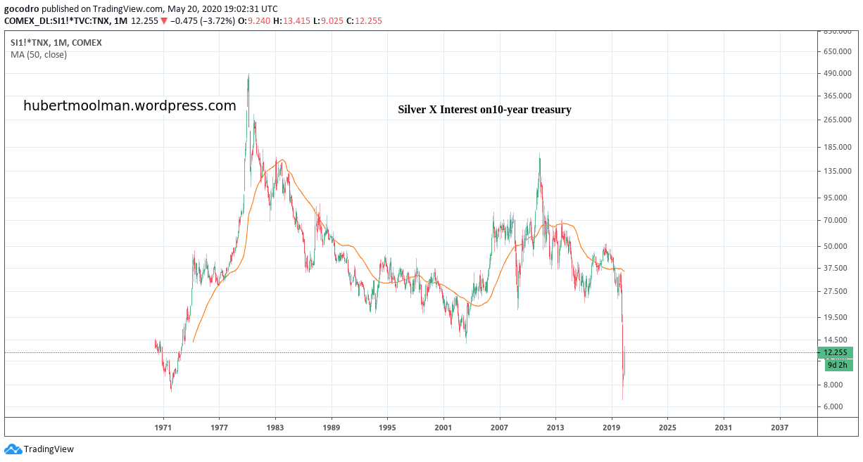 It features the Silver price multiplied by the interest rate on the 10-year US Treasury. It has just recently hit a new low, even lower than the 1971 low. It is still a long way before Silver is at relatively high prices, and debts at lows (or interest rates at highs), which means this chart will then likely be at all-time highs.