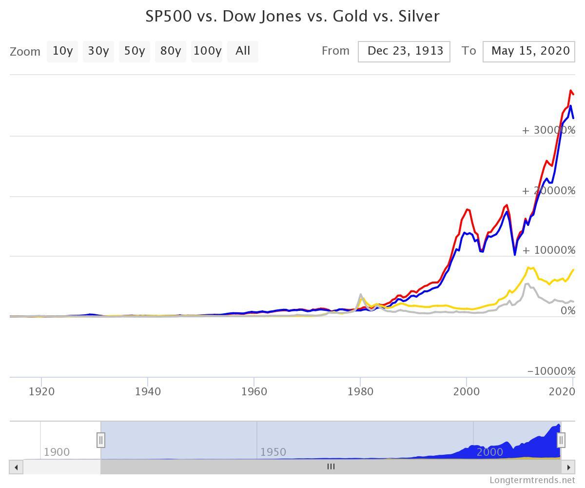 Since the creation of the Federal Reserve in 1913, the stock market has outperformed Gold and Silver significantly. Here is a great chart (from longtermtrends.net) that proves this: