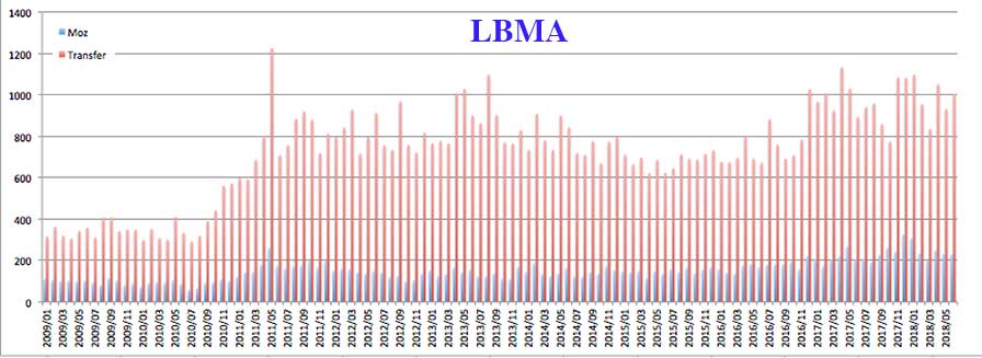In 2009, the LBMA’s members moved from one vault to another a total of 1 064 Moz. In 2017, they transferred 2 390 Moz.