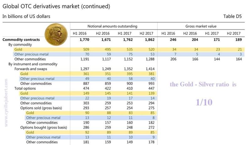 If you study the global derivatives statistics on the BIS’s website here, the ratio between gold and silver is once more 1/10.