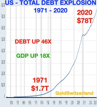 For 50 years, unlimited paper or fiat money has been created without any service or goods produced in exchange. Since 1971, total US debt has gone from $1.7t to $78t. In the same period, prices for houses, goods and services have exploded but most consumers are not aware of this since it is a slow process. As the chart below shows, debt has surged 46x in 1971-2020 whilst GDP is up only 18x. So the US economy is running on empty as more debt is required to raise GDP.