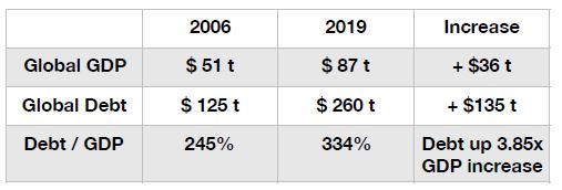 So $135 trillion has been created out of thin air and no one needed to do any work or produce any goods. The money just dropped down from above or spurted out of computers. Just look at that manufactured and fake money in relation to global GDP. In 2006, global GDP was $51 trillion and debt $125 trillion which was 245% of GDP. Today GDP is $87 trillion and debt $260 trillion. That means the world has achieved an increase in GDP since 2006 of $36 trillion but had to print $135 trillion to achieve this which is almost 4x the increase in GDP. So for every dollar of GDP increase $4 had to be printed.