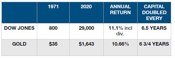 FOR 49 YEARS THE DOW DOUBLED EVERY 6.5 YEARS AND GOLD EVERY 6 3/4 YEARS