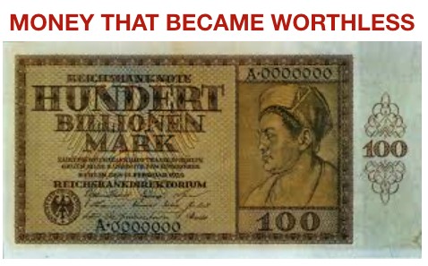 It wasn’t that long ago that Germany experienced hyperinflation which was in the early 1920s in the Weimar Republic. Above is a 100 trillion mark note. (Billion in German is Trillion)