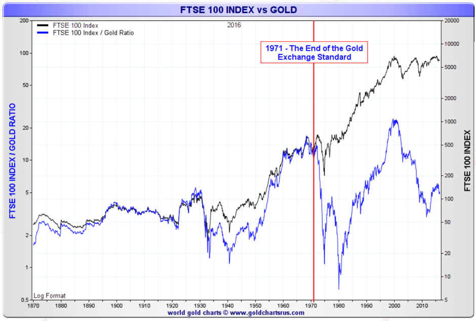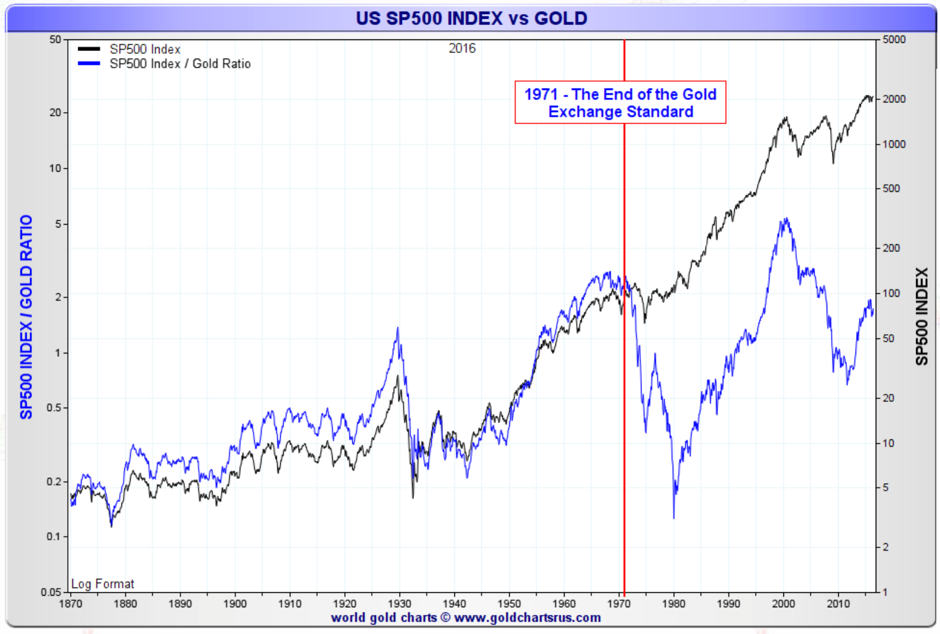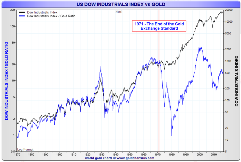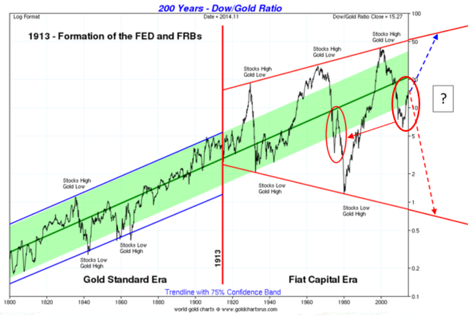 We hear constantly on the news that stocks are at all-time highs. As you can see in the chart below, stocks are nowhere near all-time highs when valued in real money. If history repeats itself it looks more like we are in a correction within a major bear market started in 2000 rather than in a bull market. This doesn’t exclude a continuation of the bull stock market in fiat currency and, at the same time, a larger decrease of the price of dollars in gold. This will push the real price (in gold) of stocks down rather than up.