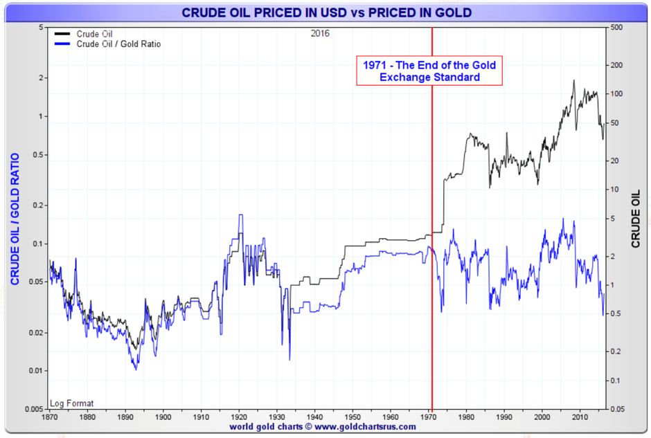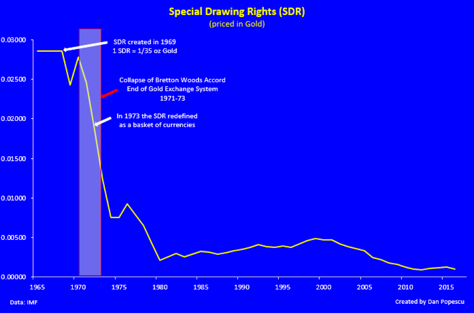 If we look at the SDR global currency, which is a basket/index of the major currencies, we see that since it was created, its value has followed that of the US dollar with respect to gold. The SDR was created in 1969 and the value of an SDR was defined as equivalent to 0.888671 gram of fine gold which, then, was also equivalent to 1 US dollar (1oz of gold = 35 SDRs = US$35). Today the SDR is valued based on four currencies (US dollar, EU euro, British pound and Japanese yen). Starting October 2016, the Chinese Yuan will be added to the basket/index. As you can see, it also lost most of its 1970 value with respect to gold.