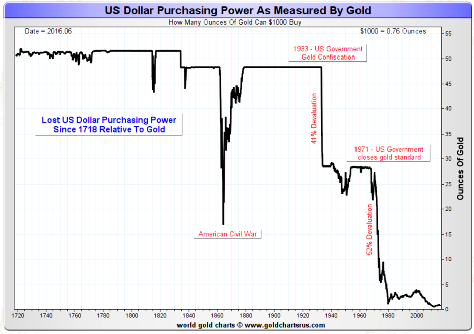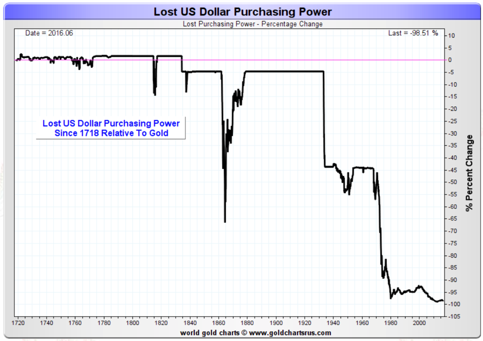 Last but not least, below you have also the collapse of purchasing power of the US dollar. As you can see, since 1700 the US dollar lost almost all of its purchasing power (98.51%), and most of it since 1940.