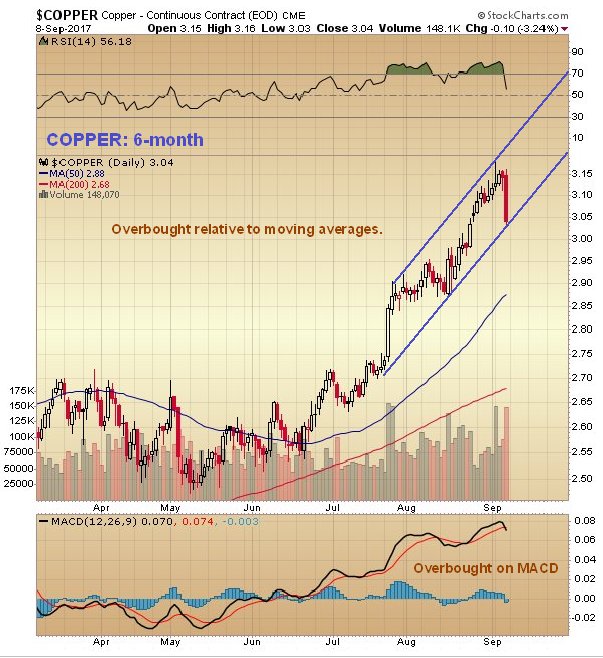 We have seen how copper, known as Dr Copper because it tends to lead the economy and lead the metals, has been in the vanguard of the recent metals rally. Thus it is interesting to observe on its 6-month chart below how it suddenly dropped hard on Friday having become overbought, which is thought to presage a dollar rebound and a near-term drop by other metals, like gold and silver.