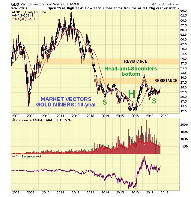 Like gold itself, gold stocks are preparing to break out of a giant 4-year long Head-and-Shoulders bottom. They are still quite a way from having broken out, as we can see on the 10-year chart for GDX shown below, and vulnerable to a near-term reaction on a dollar rebound, that should not see them lose much ground. The big volume on the rally during the 1st half of last year showed that the bottom was in and that a major new bullmarket is in prospect. The formation of the Right Shoulder of this H&S bottom served to correct this strong advance.