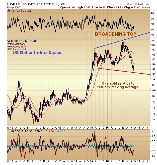 We will now look at some of the big reasons that the dollar could rally soon. On the 8-year chart for the dollar index we can immediately see one of them – the dollar has now arrived at the lower boundary of a large Broadening Top pattern in an oversold state, and while it is believed to be destined to break down from this pattern in due course, it looks likely that it will bounce of its lower boundary over the short to medium-term to correct the oversold condition before going on to break down later.