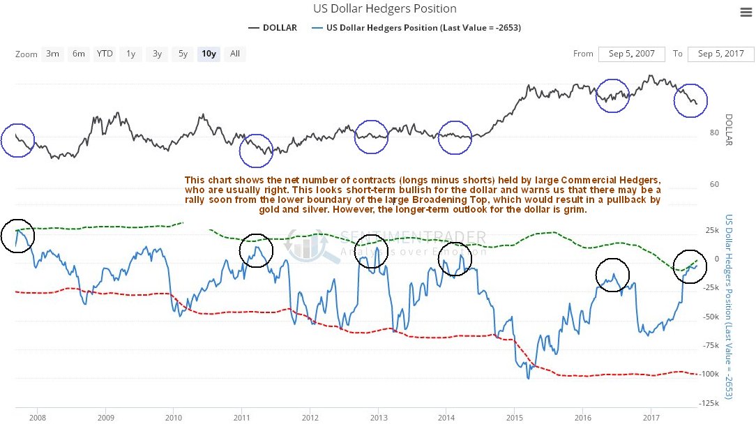 Another important factor suggesting that the dollar is likely to rally short-term is the latest dollar Hedgers chart, which is now quite strongly bullish. On this chart we see that large Commercial Hedgers, who are almost always right, have cashed in nearly all of their net short positions for a nice fat profit, so that they are now at a very low level, and they would be unlikely to do this if the dollar was set to drop much further. On this chart we also have the benefit of seeing what happened to the dollar soon after they did this on earlier occasions. As we can see it usually rose.