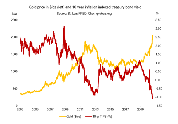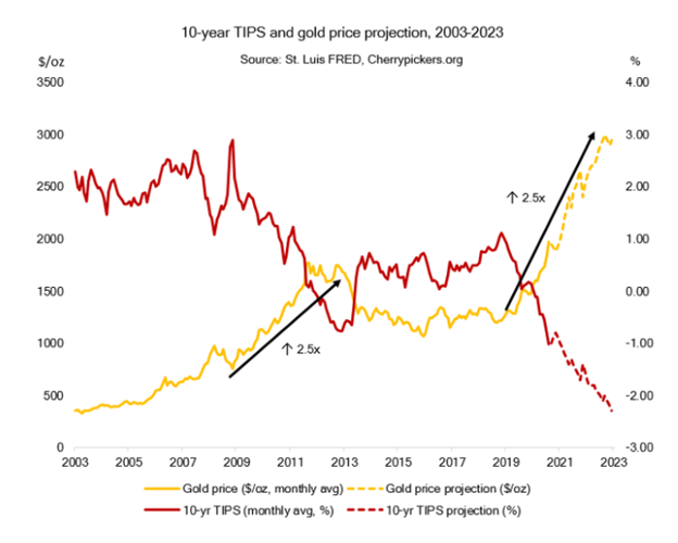 The golden case for gold boils down to this: Gold rises when inflation adjusted Treasury yields sink into negative territory with increasing speed.