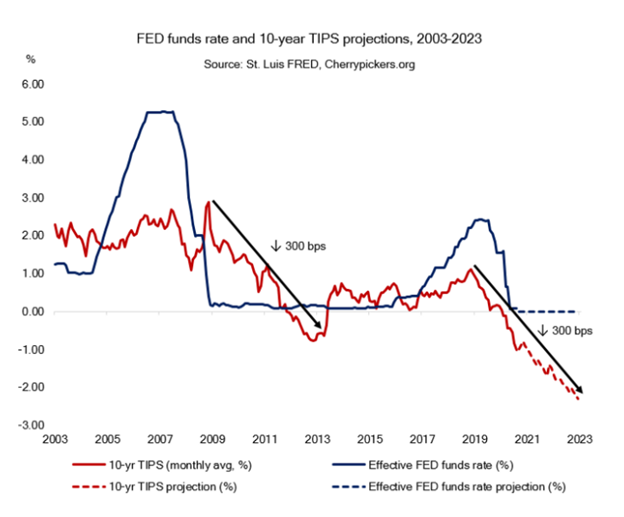 A key proxy for declining yields and rates comes from the Fed’s own, “forward-guided” projections on declining 10-year TIPS: