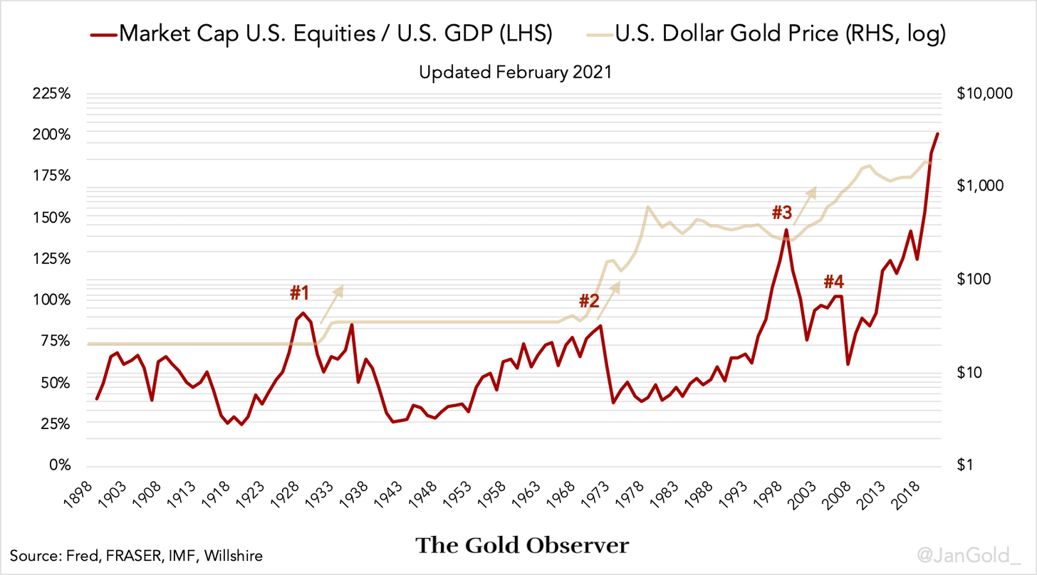 For the first time ever the total value of the U.S. equity market is worth twice as much as the real economy. A true financial bubble. Previous highs of the equity to GDP ratio were followed by significant gains in the price of gold. This time around I expect the gold price to rise as well.