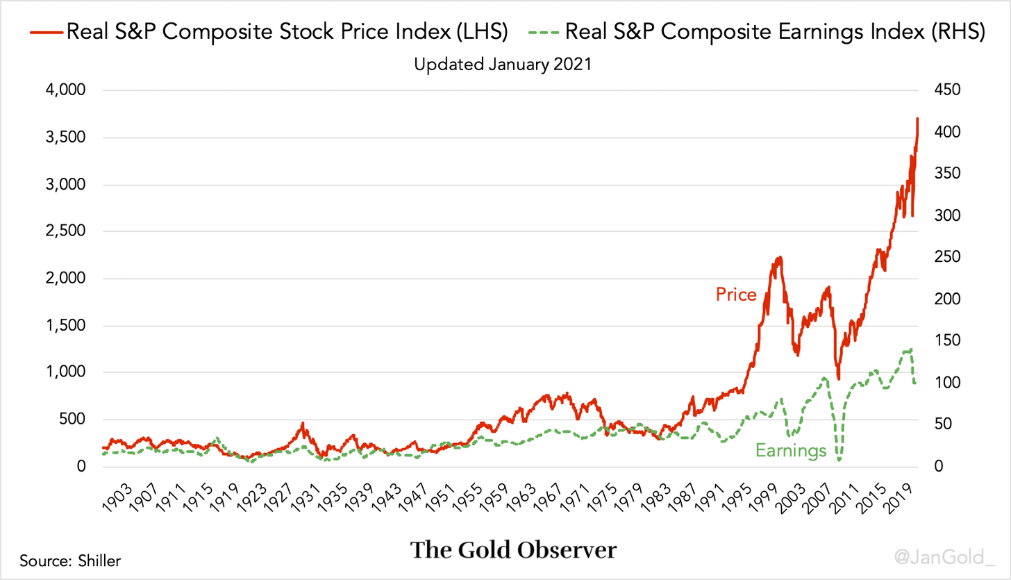 When the dot.com bubble in the late 1990s popped, the Federal Reserve lowered interest rates to 1%. Low interest rates boosted financial assets and caused inflation to trend upwards. The gold price began its march from $270 dollars in 2000 to $1,900 dollars in 2011, up 640% (see “#3” in chart 1). Along the way the gold price was supported by the subprime mortgage crisis in 2008 (see “#4” in chart 1). After 2008 the Federal Reserve unleashed unconventional monetary policy. The Fed lowered short-term interest rates to 0% and started printing unprecedented amounts of money to buy bonds and mortgage-backed securities to lower long-term interest rates. Ever easier money has fueled stock (and bond) markets to extraordinary highs. In chart 2 you can see that stock prices have totally detached from corporate earnings.
