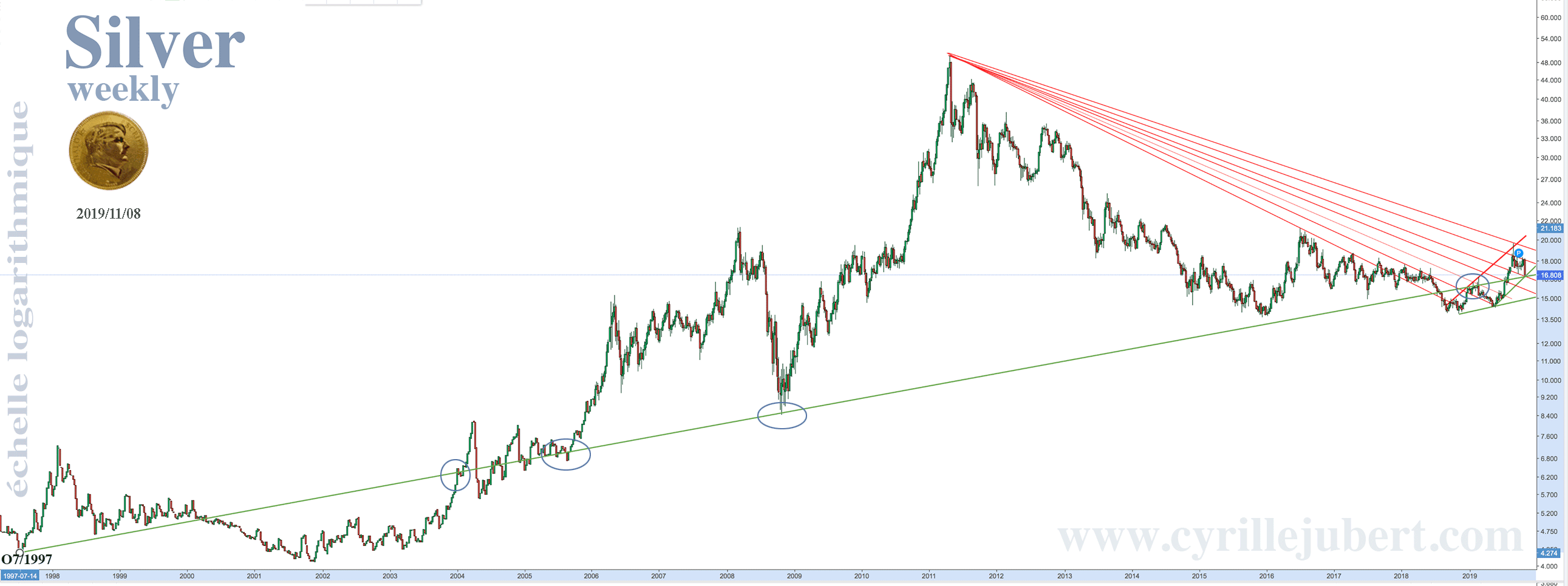 On this weekly silver chart dated 8/11/2019, first have a look at the Fibonacci's fans (in red), which fall from the 2011 peak. (I erased those that have already been played.)