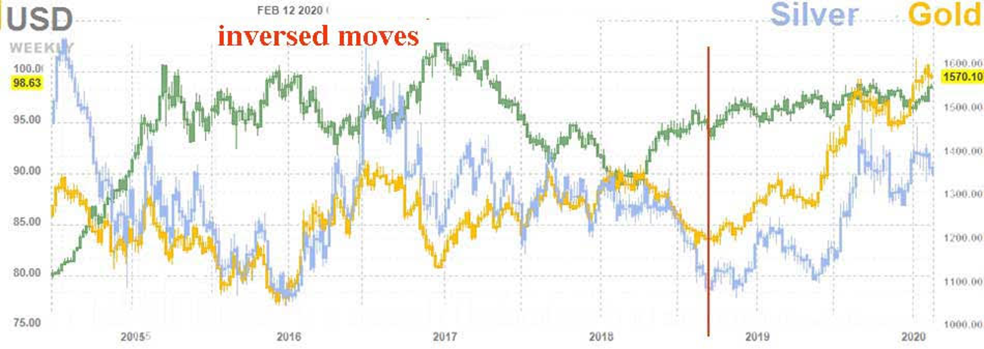 On the 3/4 of the graph on the left, we see that a rise in the dollar (green) caused a fall in gold and an even greater fall in silver.